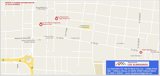 * Hay bancos, cajeros automáticos y casas de cambio en el centro de Merlo.