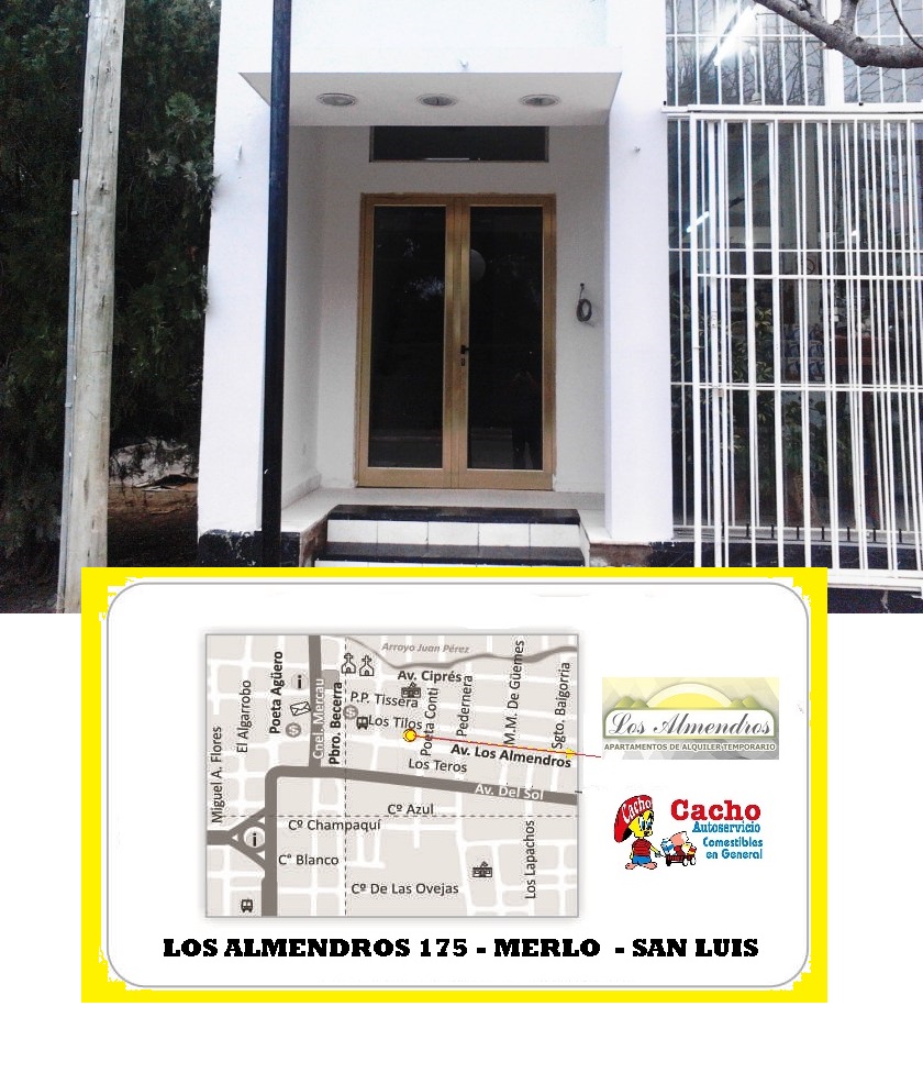 Al entrar a la rotonda de Merlo, tome hacia la izquierda, entrando hacia Merlo. Continúe 2 cuadras por esa calle que ahora toma el nombre de Poeta Aguero y en la esquina con Janson tome hacia la derecha. La calle Janson, dos cuadras más adelante cambia de nombre a Avenida Los Almendros. Menos de dos cuadras hacia adelante a la altura 175 se encuentra Departamentos Los Almendros.